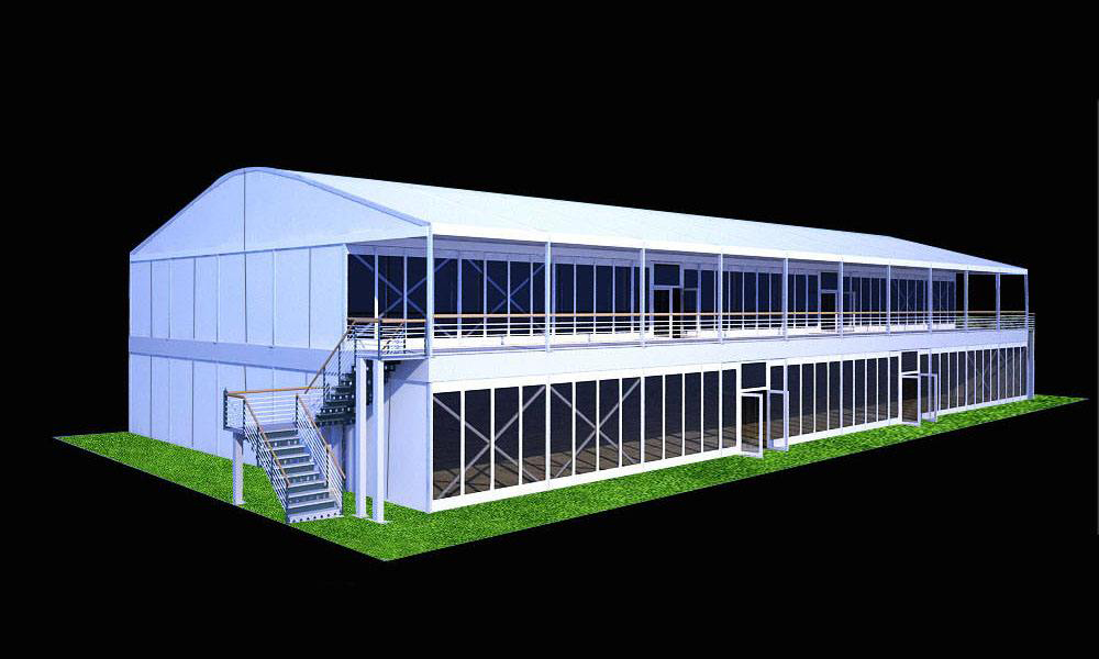顾名思义,双层篷房是由两层结构篷房组合而成,双层篷房又按照形状分为两种,分为DDS人字型顶(跨度尺寸有10-30m ,主要管径300x125x5/8mm)和ADDS弧型顶(跨度尺寸15-30m,主要管径300x125x5/8mm)两个不同型号,双层篷房设计坚固耐用,抗风速达100公里/小时(风载荷0.5千牛/平方米),篷房具有更高的抗风和抗雪载能力。